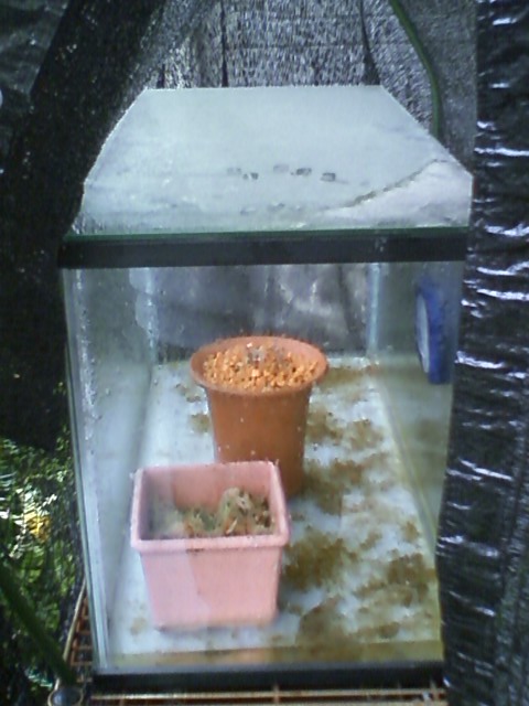 室外でも水槽でセファロタスを栽培しています。遮光ネットを掛けての栽培ですが、こちらの方が発育はあまり良くないかも。成長点から伸びるのが遅いです。ただ、太陽光のお陰か袋は室内栽培に比べて色と形は綺麗です。