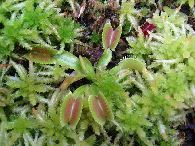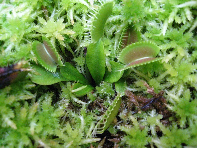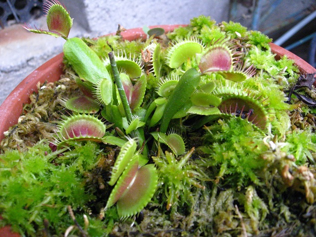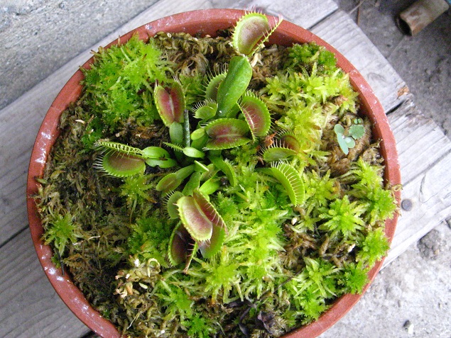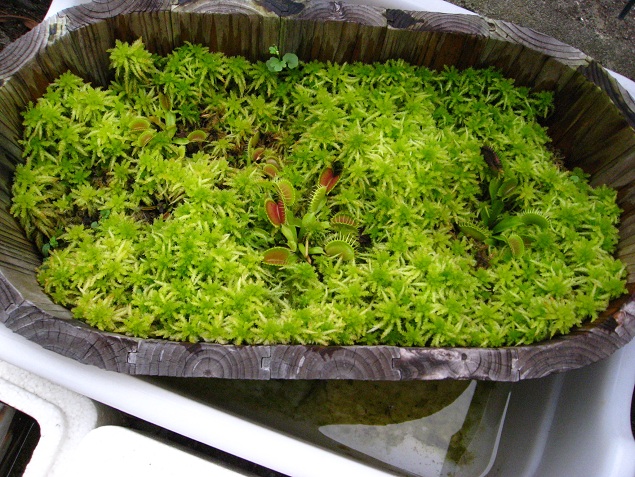 木の鉢と生水苔で育てているハエトリソウ。この鉢が一番、病気の被害が酷く何株かは処分してます。